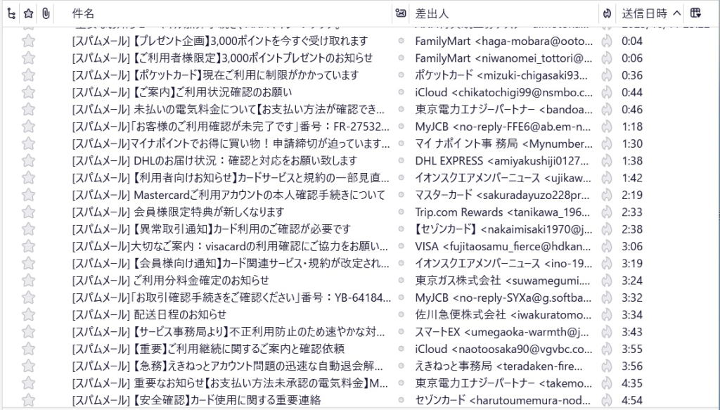 写真は午前0時から5時までに検出された怪しいメールの一覧です。因みにこの時間帯に正しいサイトからのメールは0件でした。主にカード会社、電力・ガス会社、コンビニなどを語り怪しいサイトに導こうとするものです。写真をダブルクリックしてください。