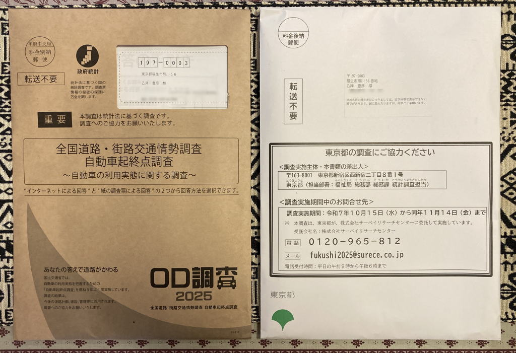 今週、ぶ厚い封筒が続いて届きました。写真の左側が「OD調査2025」と書かれた「全国道路・街路交通情勢調査 自動車起終点終点調査~自動車の利用実態に関する調査~」というもので国土交通省道路局によるものです。右側が「令和7年度 東京都福祉保健基礎調査(高齢者の生活実態)」というもの東京都福祉局からのものです。