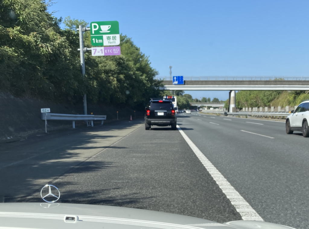 途中、寄居PAにスマートインターチェンジがあるのでそこで降りようと進みました。PA手前3㎞ほどの地点で路側帯に車の列ができていました。同じ考えのドライバーが多いのかもしれません。前の方に派手な模様の西郡観光バスが4、5台見えます。バスも諦めるほどなのか。写真がその模様で、PAまで1㎞の地点で車が並んでいるところです。
