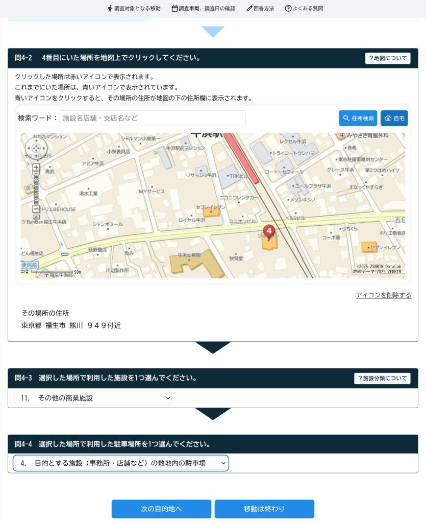 10月16日(木)のこのページで報告した国土交通省と東京都からの調査に回答しました。回答用紙に手書きでも回答できますが、どちらもWebで回答できます。まず国土交通省のOD調査、結構細かい事柄も含まれます。ログインして進むととても良くできたページです。車で何処に行ったか答えるのですが、目的地の住所が求められます。左の写真がその画面ですが、地図上のポイント(施設名も表示されます)をクリックすると番地が表示されます。感激。