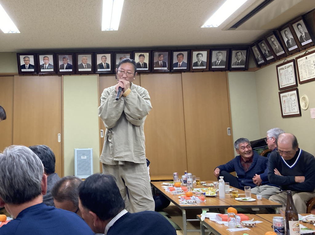 写真は多満自慢のご当主(この時間はハーモニカ奏者)が皆も歌えるお正月の歌を演奏しているところです。あんなに小さなハーモニカからよくあんなに高い、大きな音が出せるか不思議です。というと失礼かもしれませんが、すごい。和気あいあいと過ごした新年会もお開き、本年もよろしくお願いいたします。