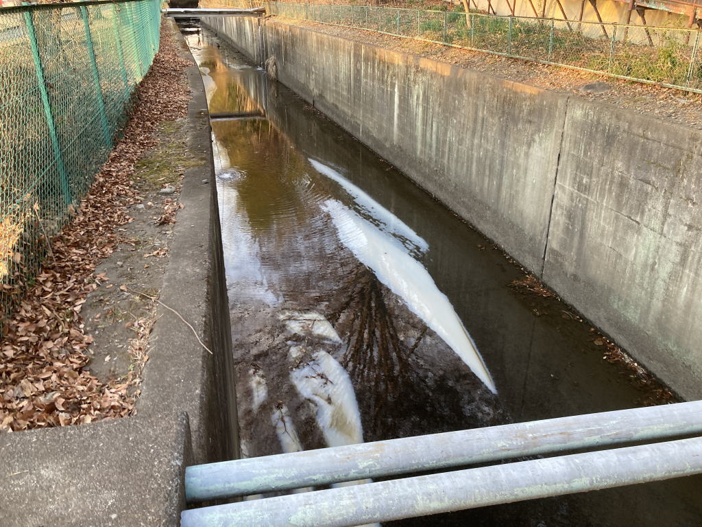 ふと下の川を見ると何やら白い帯がところどころに溜まっています。昭島市との境からどうどう橋のたもとまで何カ所も続きます。写真はどうどう橋から南公園に下りる橋の上から撮ったものです。