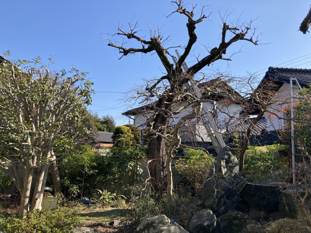 他にサザンカ、ウメ、モチ、シャラ(ナツツバキ)、ツバキ、モチノキ、サルスベリも剪定しました。手に負えないマキ、ヤマモモ、カイヅケイブキなどは植木屋さんにお願いしました。