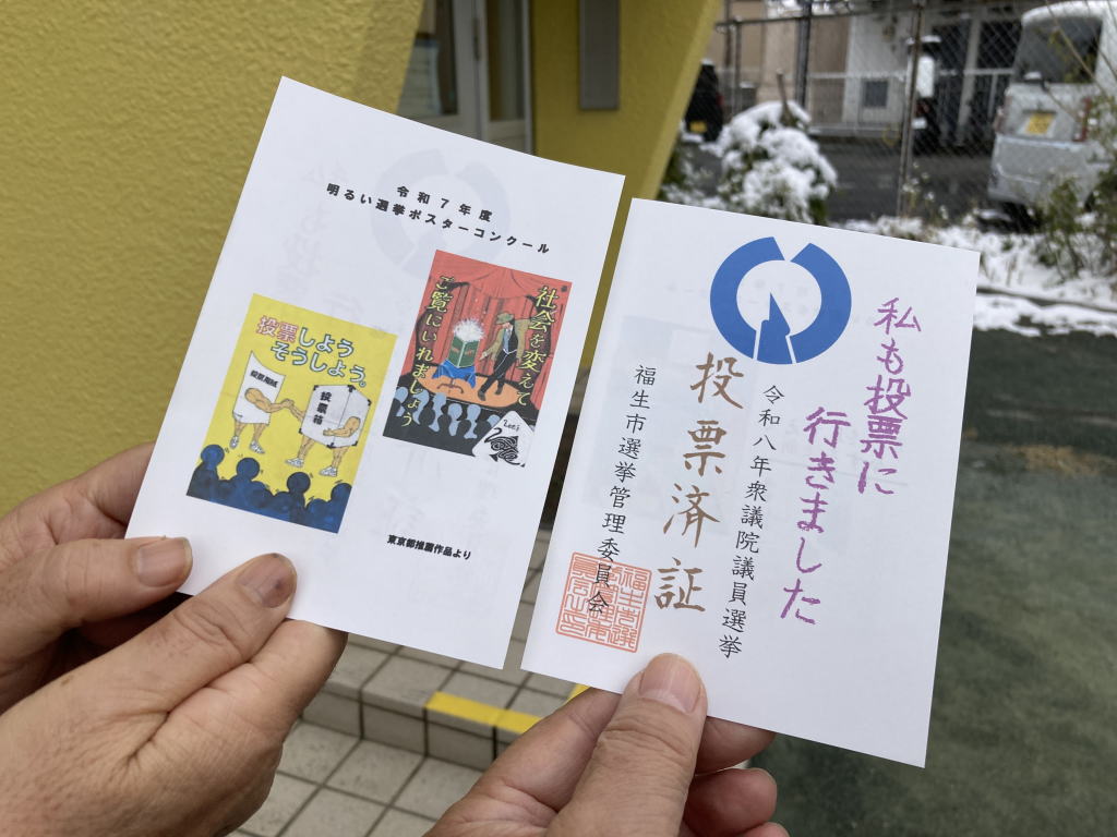写真は出口で明るい選挙推進委員の方から渡された投票済証です。裏には明るい選挙ポスターコンクールのポスターが印刷されていました。